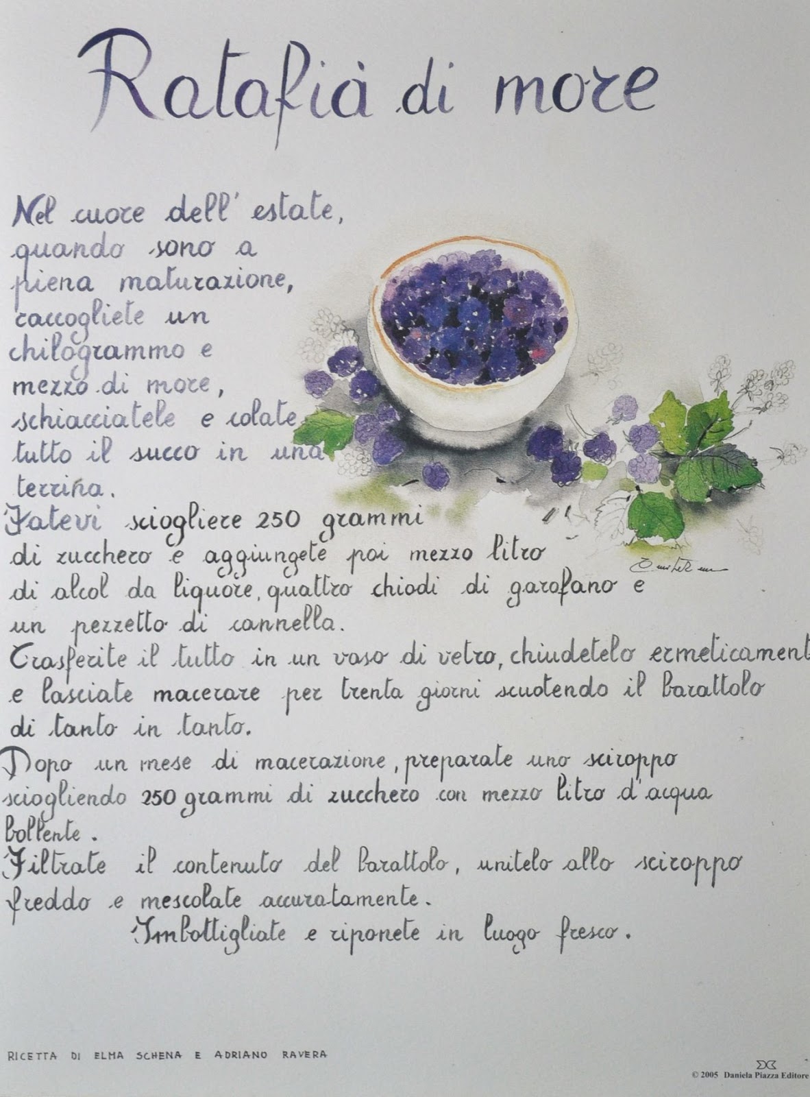 Ora passiamo al bello: le tre stampe! Si tratta della riproduzione di tre ricette acquerellate di E. Schena e A. Ravera, autori di libri bellissimi sulla cultura gastronomica piemontese (di loro ho parlato qui). Le ho scelte perché sono tre ricette un po’ particolari, fatte con frutta che rappresenta bene il profumo dell’estate -da giugno a settembre- nel basso Piemonte (“Ciliegie al Nebbiolo”, “Ratafià di More” e “Schiacciata di Susine Damaschine”). Infine, le tre stampe (30x40) stanno bene una accanto all’altra anche dal punto di vista cromatico...non vi viene voglia di appenderle nella vostra cucina???